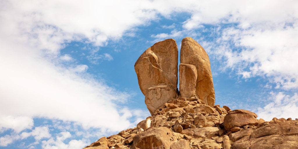 Photo: Split Rock at Horeb at Rephidim, present day Saudi Arabia. This rock is split through the middle and displays a pattern of water erosion and evidence that numerous streams came forth in several directions.