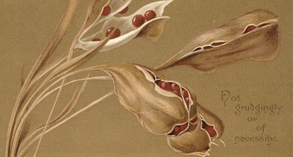 “I am crucified with Christ” — I myself in the very essence of my being, I let myself go to that death, and by the mysterious power with which God meets faith, I find that He has made it true: the bonds are loosed and He can have His way with me. See in these wild iris-pods how the last tiny threads must be broken, and with that loosing, all that they have is free for God’s use in His world around. All reluctance, all calculating, all holding in is gone; the husks are opened wide, the seeds can shed themselves unhindered…and sacrifice is the very life-breath of love. May God shew us every withholding thread of self that needs breaking still, and may His own touch shrivel it into death. (Art and quote: Lilias Trotter, Parables of the Cross.)
