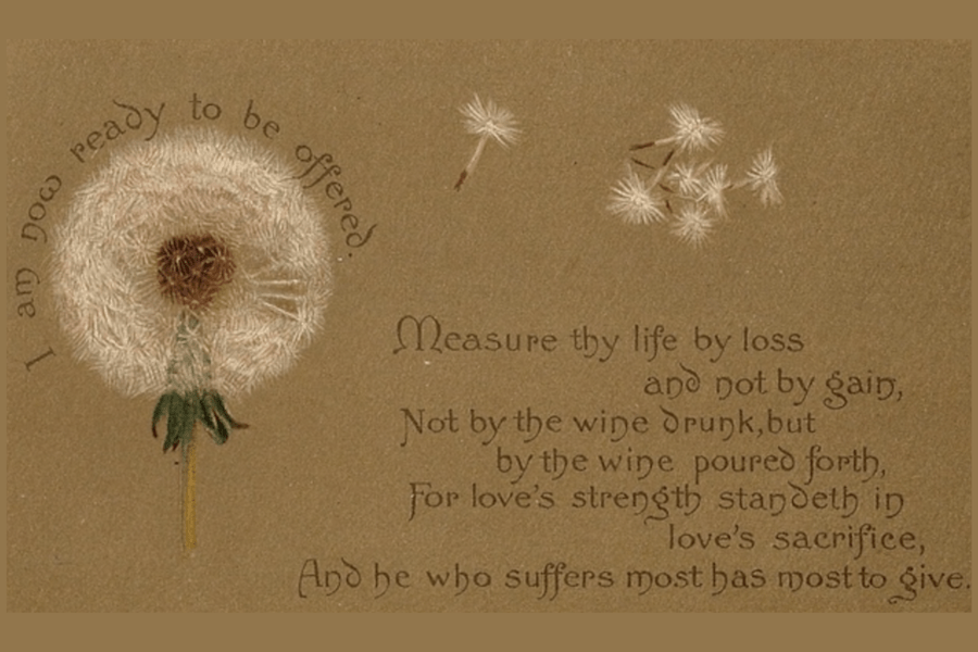 Lilias Trotter, in Parables of the Cross. Her drawing of the dandelion includes a quote on suffering by Ugo Basso, a 19th Century monk of the St. Barnabas Order.